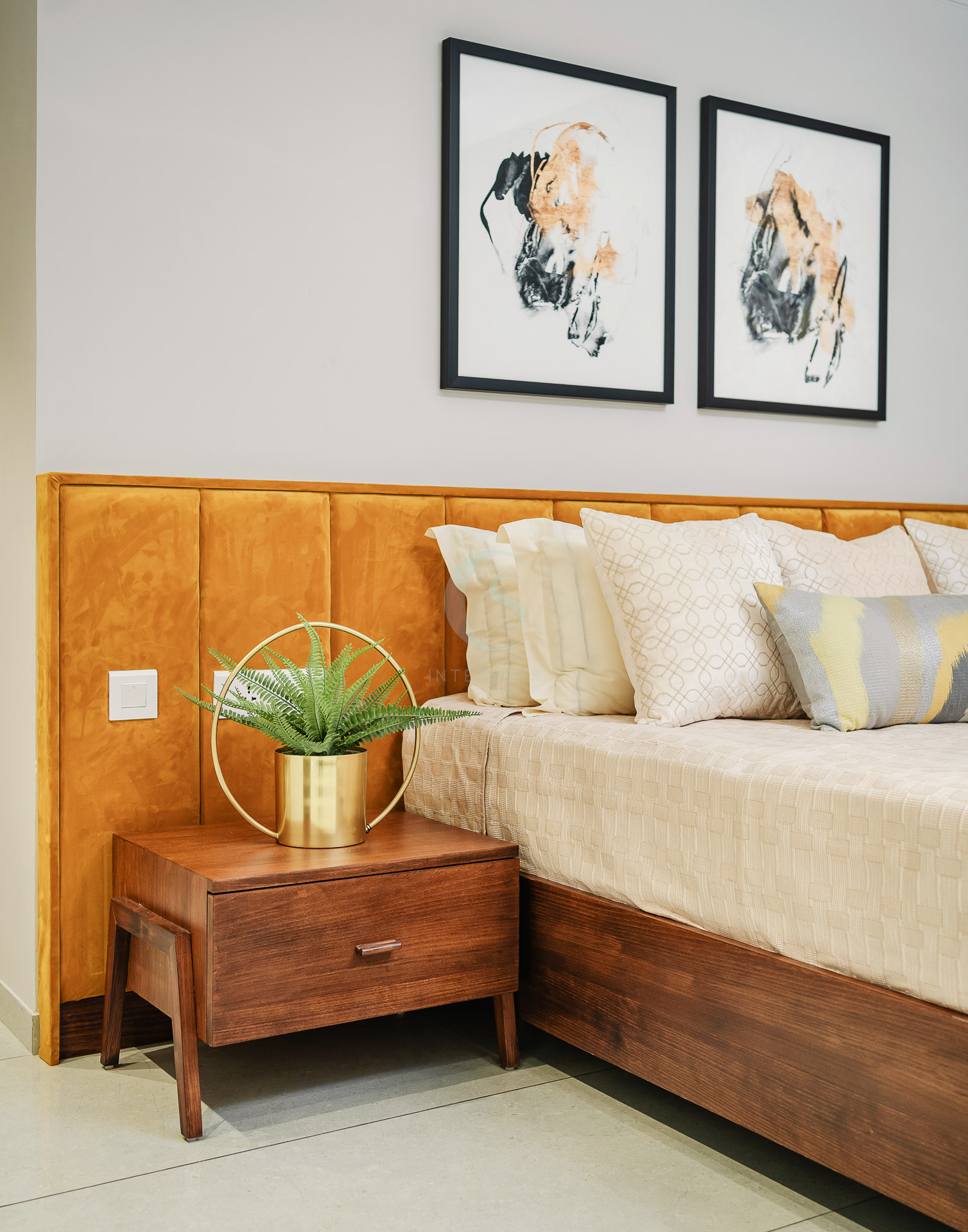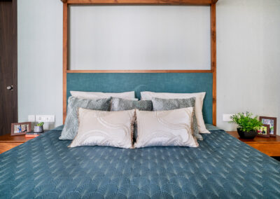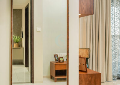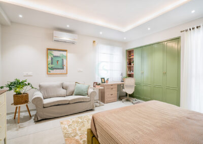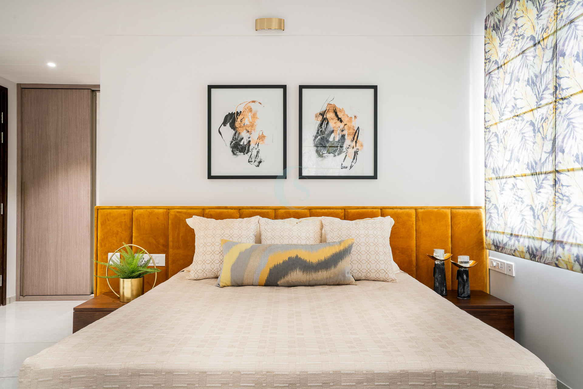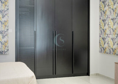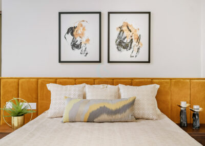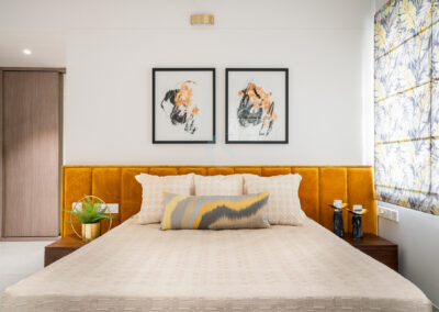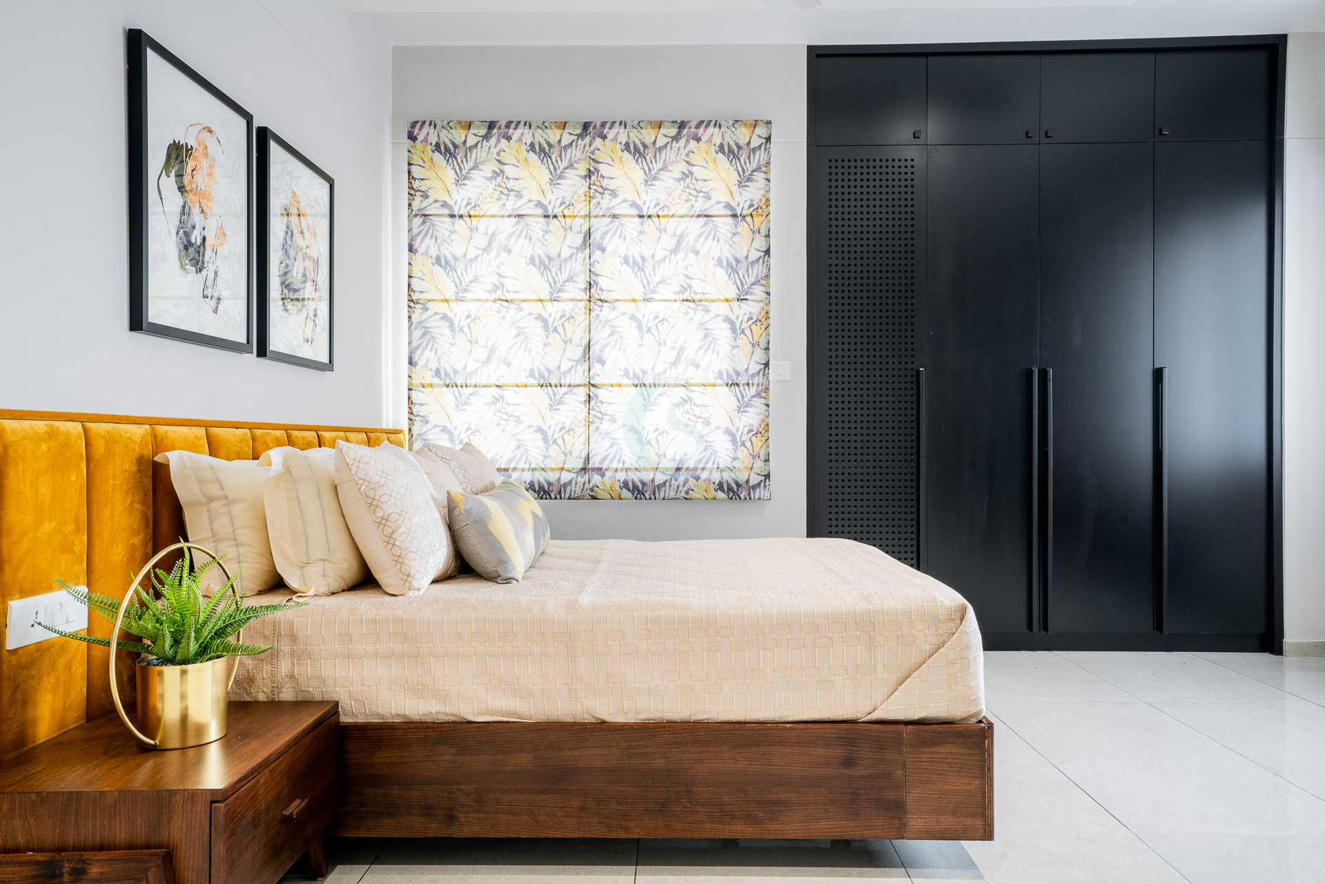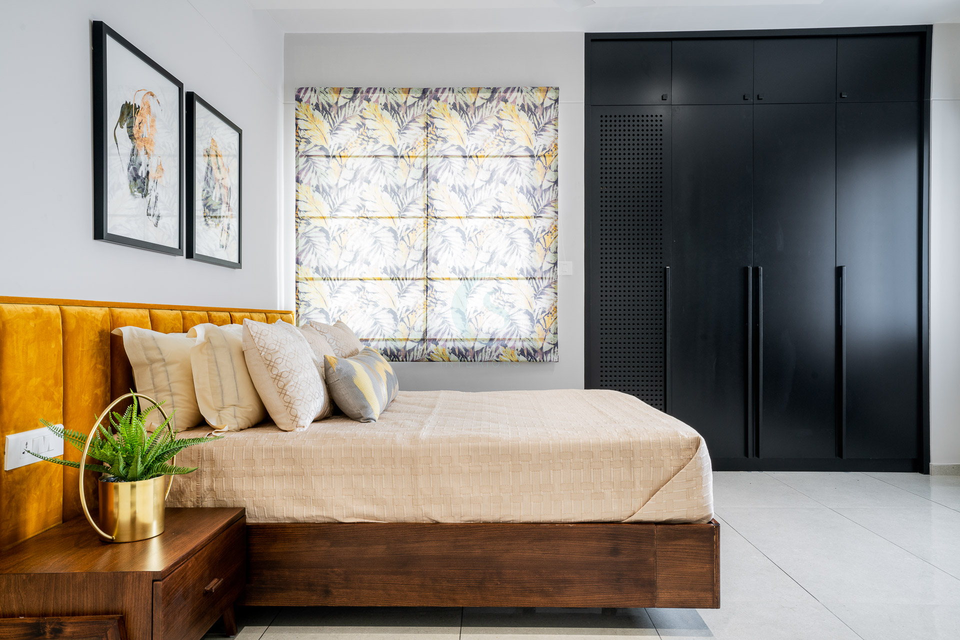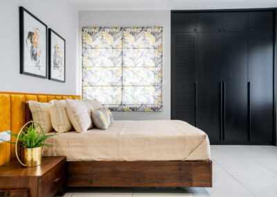 Playful bursts of floral patterns tied the interiors together, while each bedroom carried its own distinct identity. The master bedroom was anchored by a calming blue wallpaper — a designer’s personal favorite. The guest bedroom broke new ground with a bold black wardrobe, softened by mustard tones for a balanced, contemporary look.