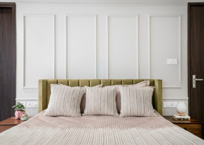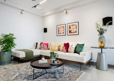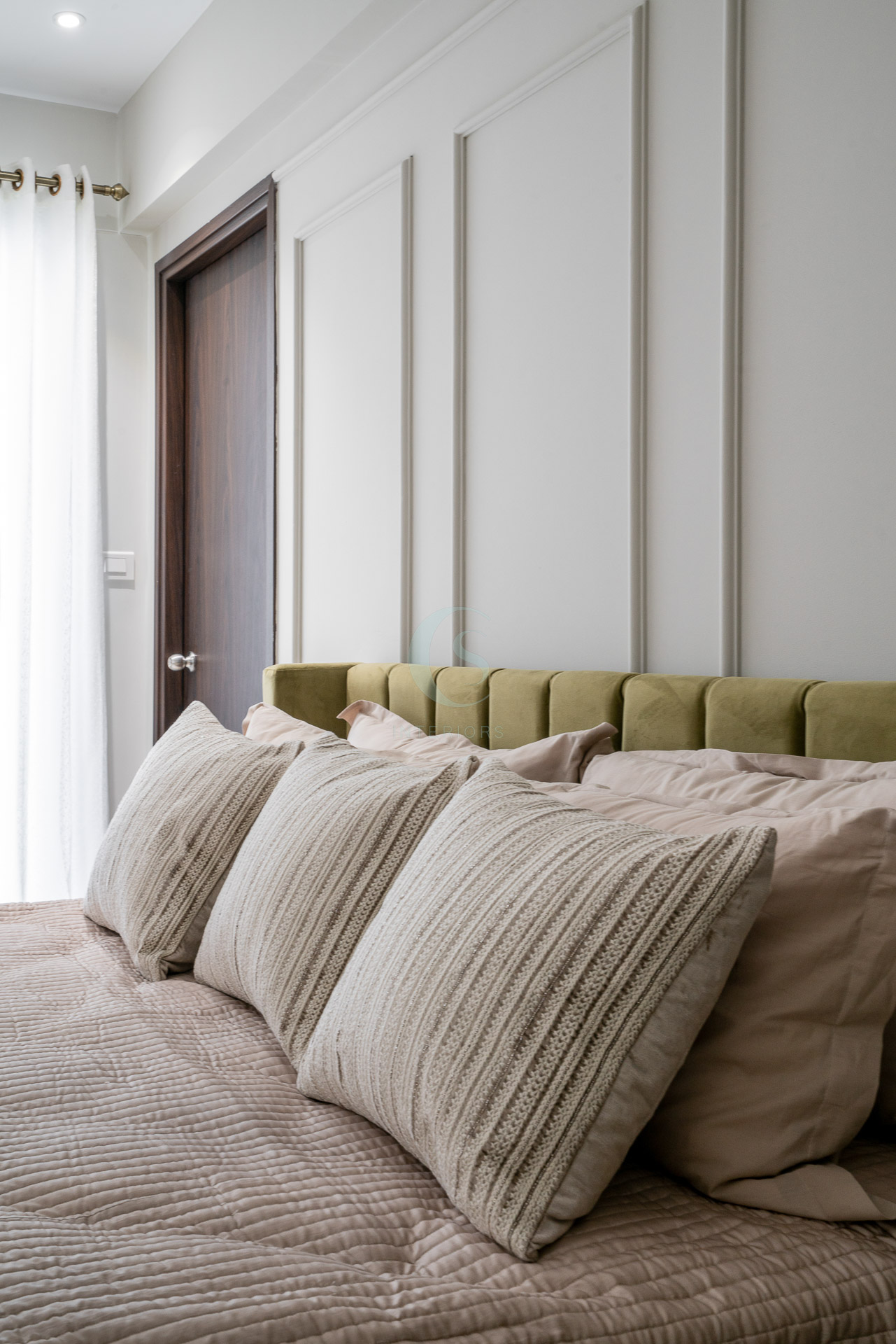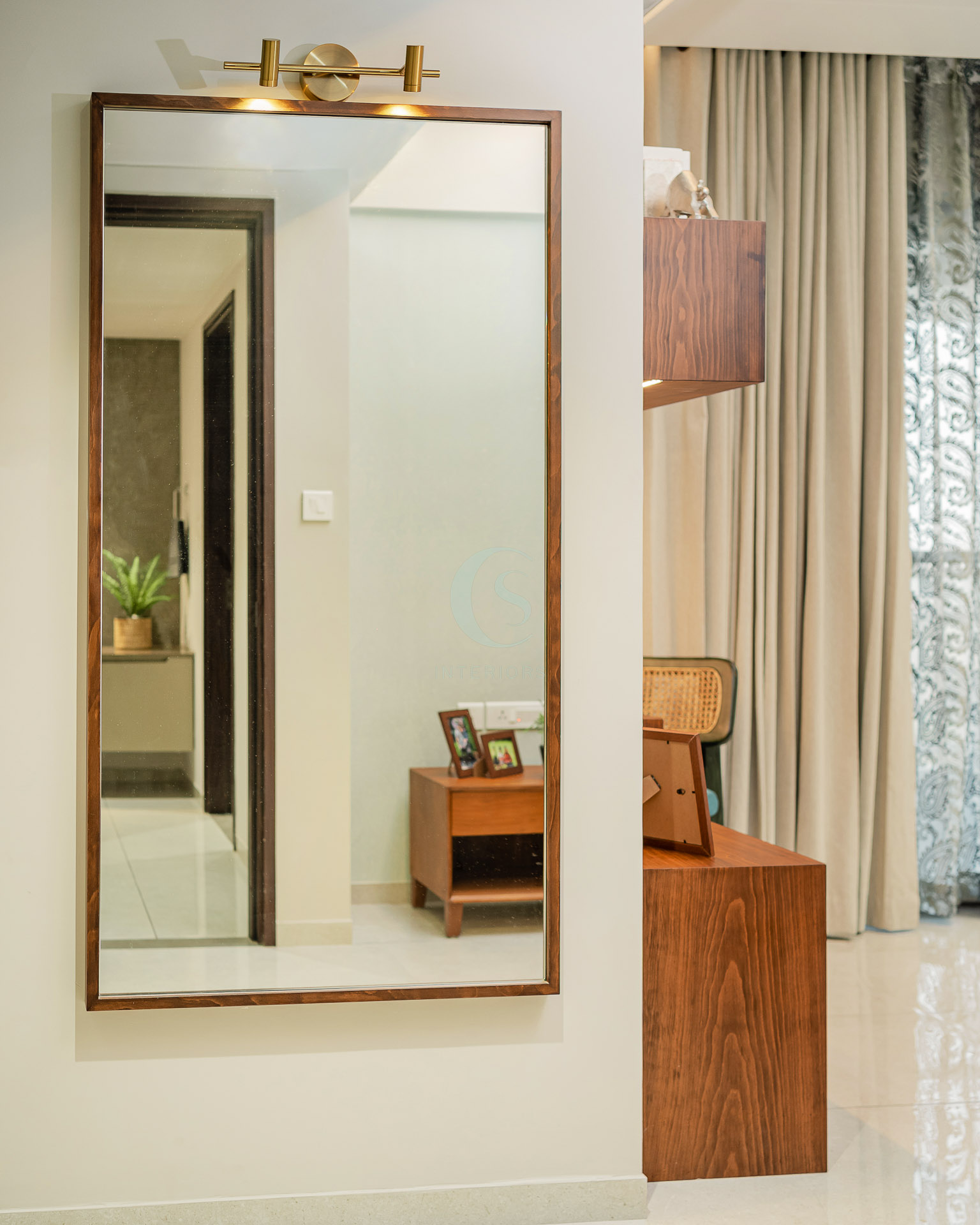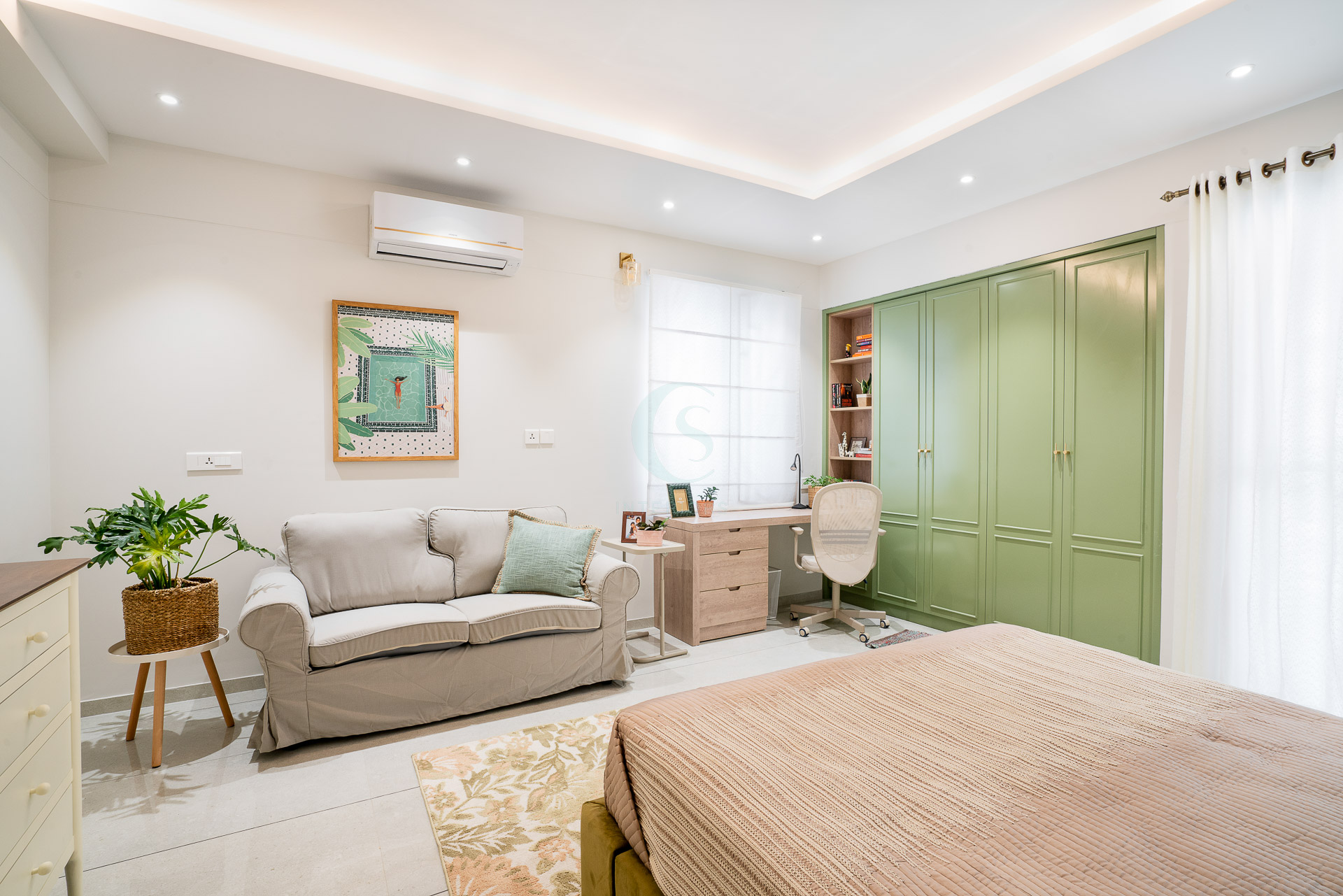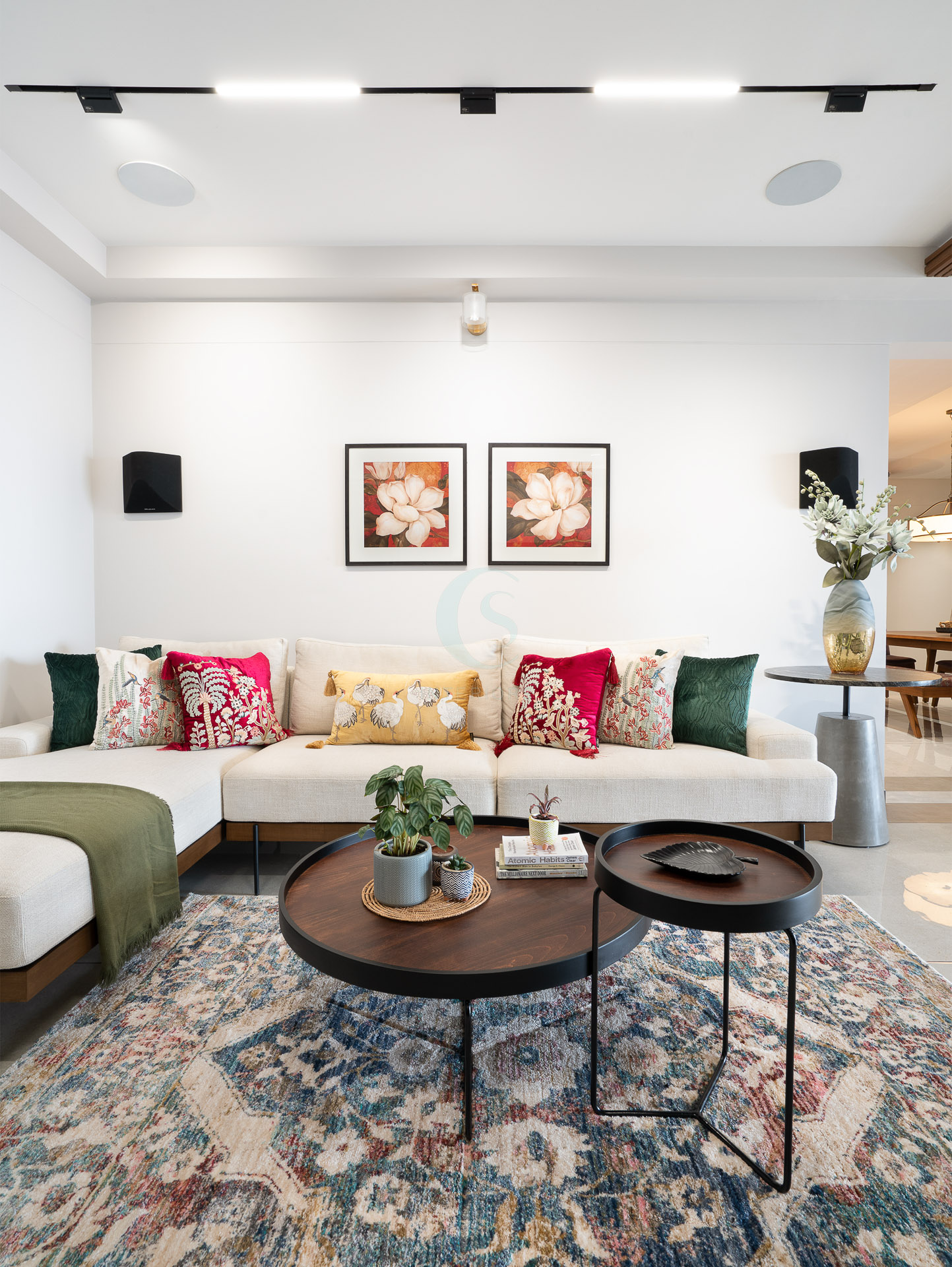 Playful bursts of floral patterns tied the interiors together, while each bedroom carried its own distinct identity. The master bedroom was anchored by a calming blue wallpaper — a designer’s personal favorite. The guest bedroom broke new ground with a bold black wardrobe, softened by mustard tones for a balanced, contemporary look.