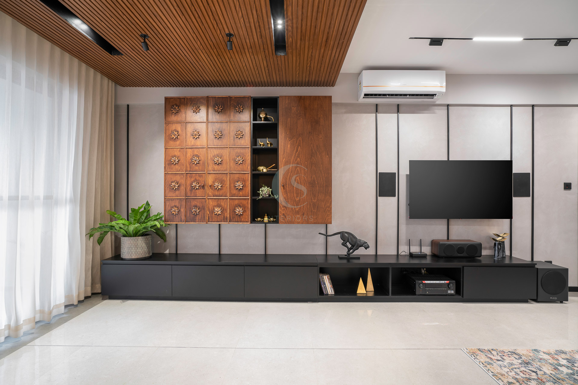 The living room doubled as a home theater, but unlike typical closed-off spaces, we created an acoustic, multifunctional open layout.