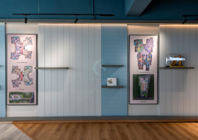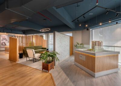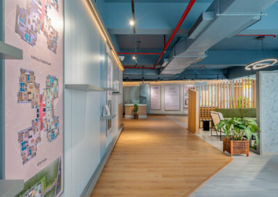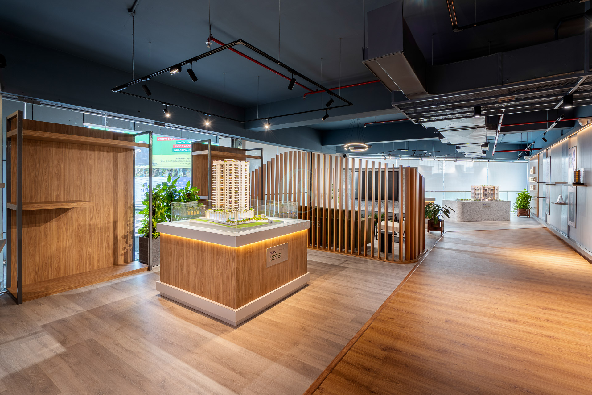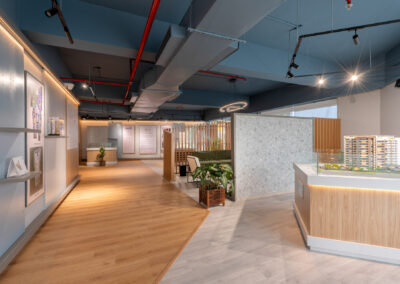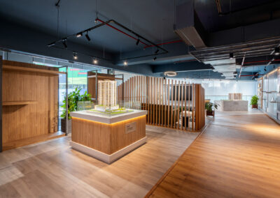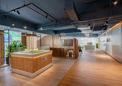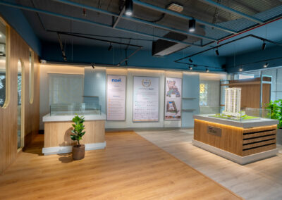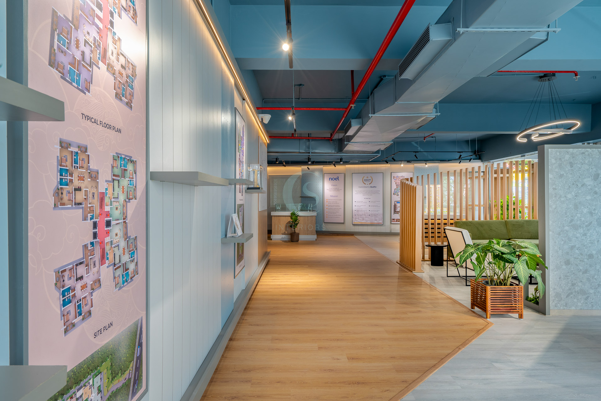 The design flow was crafted as a storytelling experience: beginning with Noel’s history and past projects, transitioning to current launches, and concluding with their ongoing ventures. To guide visitors naturally through this narrative, we developed a wayfinding strategy using flooring patterns — each type of flooring subtly directed customers from one project zone to the next, reducing confusion and improving clarity.